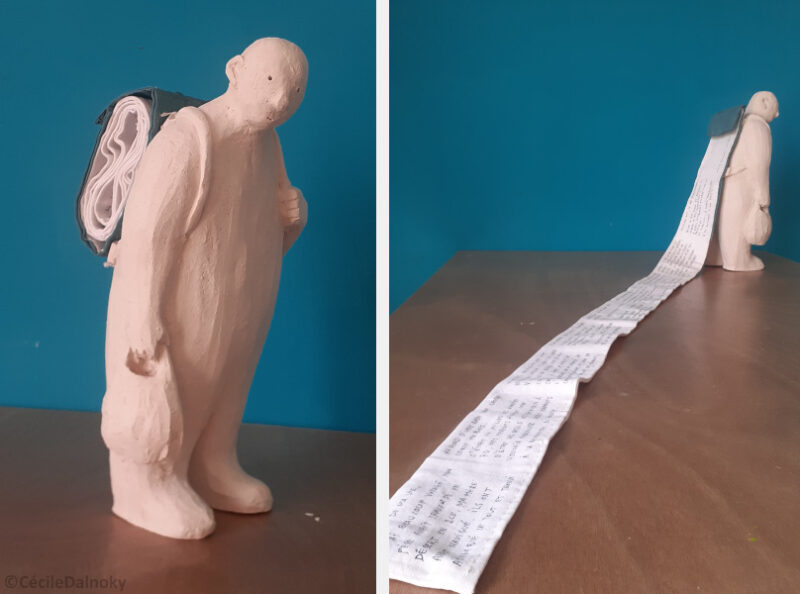 La sculpture « Quel voyage ? » trimballe un texte sur son dos. Une fois déroulé, voici ce qu’on y lit.