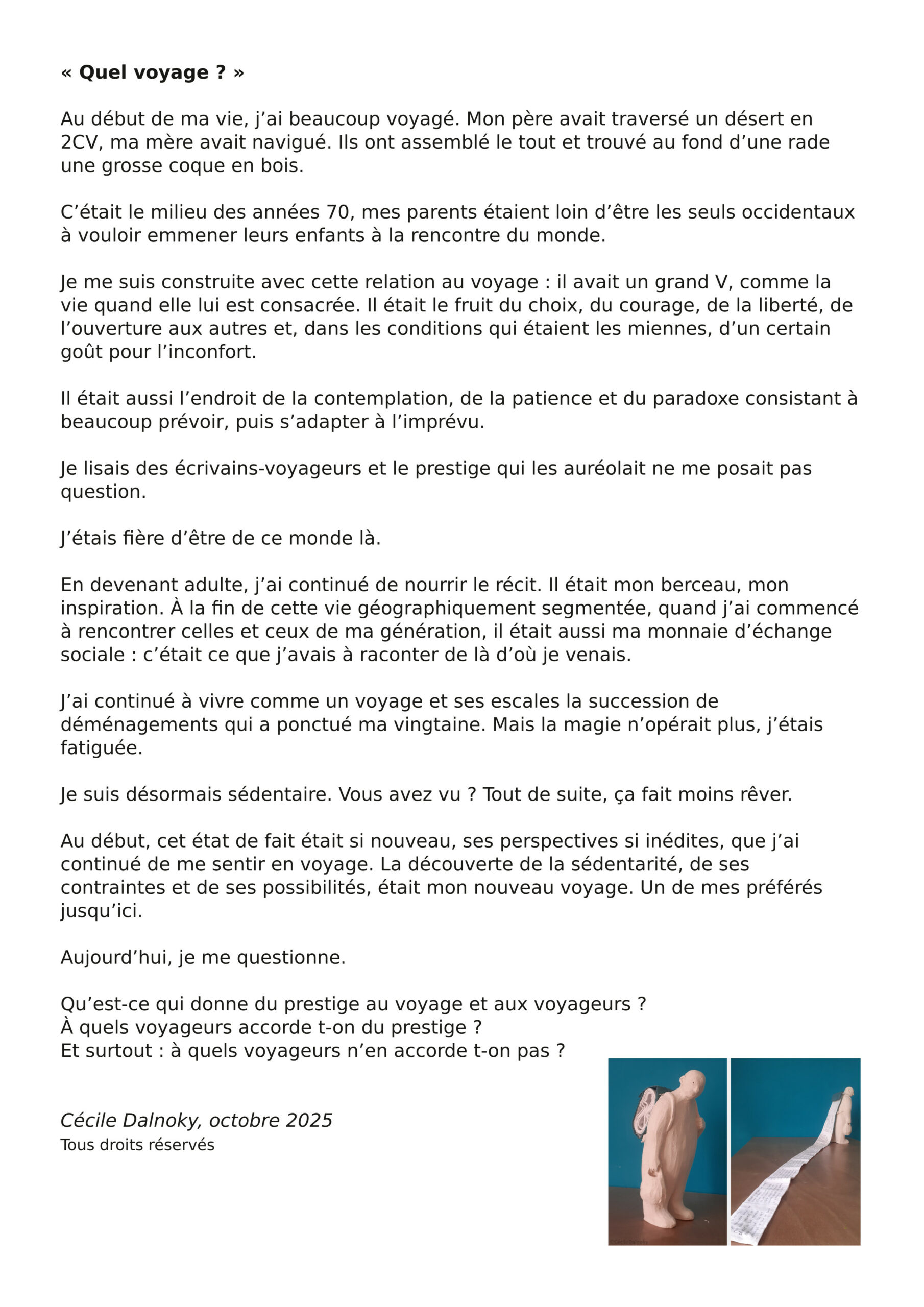 La sculpture « Quel voyage ? » trimballe un texte sur son dos. Une fois déroulé, voici ce qu’on y lit.